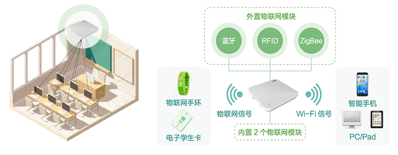 物联应用,安全管理:物联网手环/电子学生卡+物联网AP+IOTP物联网平台,通过对接第三方应用平台,可实现师生智能考勤、学生健康数据采集、课堂活跃度统计、学生的位置定位和一卡通对接等功能。