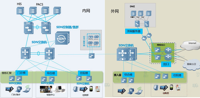 · 在医院经典组网架构的基础上,SDN网络控制器、支持SDN的交换机(目前主流交换机都已经支持支持)通过软硬件联动实现传统网络无法实现的无感准入、环路自愈、自动化运维等特性。可选接入/核心是指这套方案可以和接入交换机配合,也可以和核心配合,这样可以满足更多的客户场景(比如无法更换核心;或近期刚更换接入的场景),帮助用户以尽量小的代价快速升级到智慧网络。
