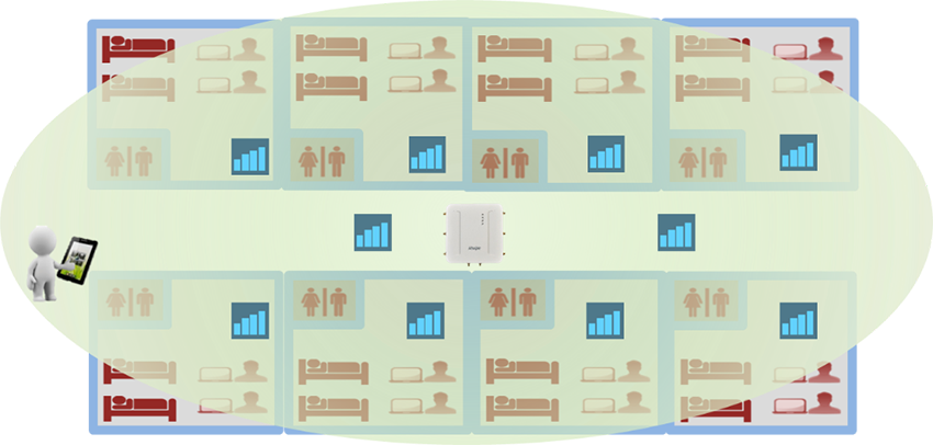 病房无线部署方案由无线基站、分布式配件和入室天线组成,移动医疗的业务可以通过无线基站中内置射频卡释放移动医疗的无线信号,无线信号再通过分布式配件中内置的干线放大单元和功率分配单元,将上下行信号放大和功率平均分成多路透过入室天线释放到病房内,整个病区的移动医疗网络信号均有单个无线基站释放,让一个病区的无线覆盖处于同一信道,同一频率的统一环境中,整个网络不存在漫游现象,使得连入无线网络的终端无论位置如何移动始终都能够保证信号不中断,让移动医护业务更加顺畅。