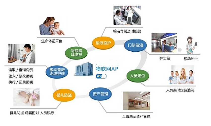 通过各类物品、标签与腕带对物品和人员进行电子化标注,以400Mhz—9000Mhz微波技术、WLAN、RFID、3/4/5G等通信技术传输数据至物联网平台,结合医院业务系统软件,完成物品、人员、流程管理,从而提升医院信息化高度、运营管理效率。为医院服务患者能力、科研教学、降低医疗事故、对接国际医疗水平提供助力。