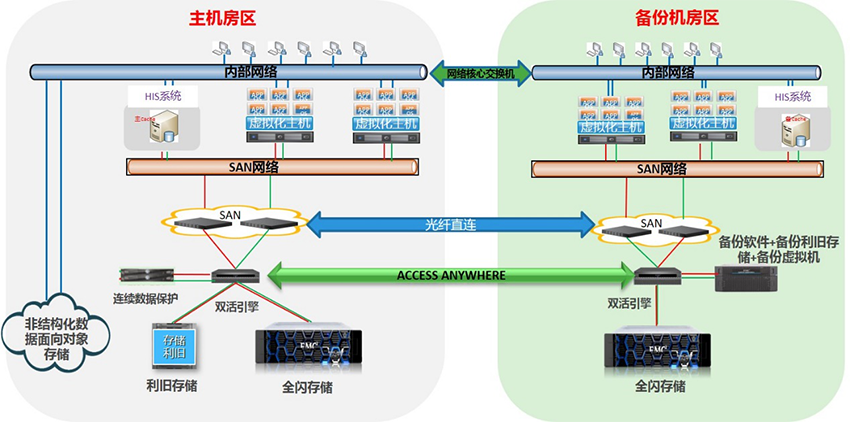 通过在主备机房分别建设一套相同架构的服务器、虚拟化平台、SAN网络、双活引擎、全闪存储,用于医院HIS、LIS、EMR等核心业务系统的承载,为业务系统提供计算资源、存储资源、高可靠的SAN网络资源。对于PACS业务系统,提供一套面向对象存储,提供良好的兼容性,为未来大数据应用、远程数据调用、应用开发提供存储兼容性;