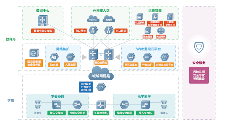 教育城域网解决方案,通过建设学校出口、城域网骨干网络、数据中心网络、城域网安全防护体系、运维管理平台等,为区、县教育局和下属学校构建一张高速、稳定、安全、易用的专网,有效促进区域教育资源均衡,并通过场景化的方案解决学生、老师、管理者在日常学习工作中遇到的各种问题。