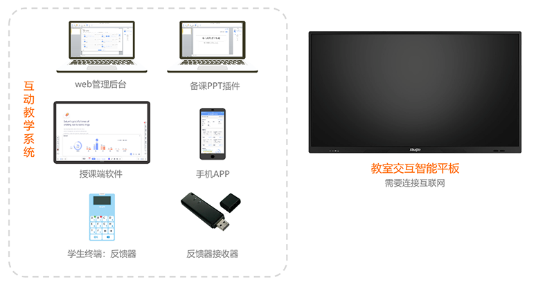 用云+端的部署方式,在普通教室中,通过配备学生人手一个反馈器,即可采集教与学过程性数据,支持大规模常态化教学应用。同时,为了提高解决方案的普适性,可兼容其他品牌的交互智能平板或电子白板等产品进行部署和应用。
