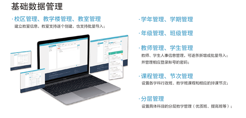 (4)一人一课表,满足校方个性需求基础数据不仅支持手工录入,而且具备灵活强大的数据导入功能(如教室、教师、学生信息数据批量导入),减少教师排课工作量。 课表在课程的教案一致、课时级别匹配、课时均匀分布等人性化方面,充分考虑教师感受和学生学习效果,方便教师教学和学生学习。