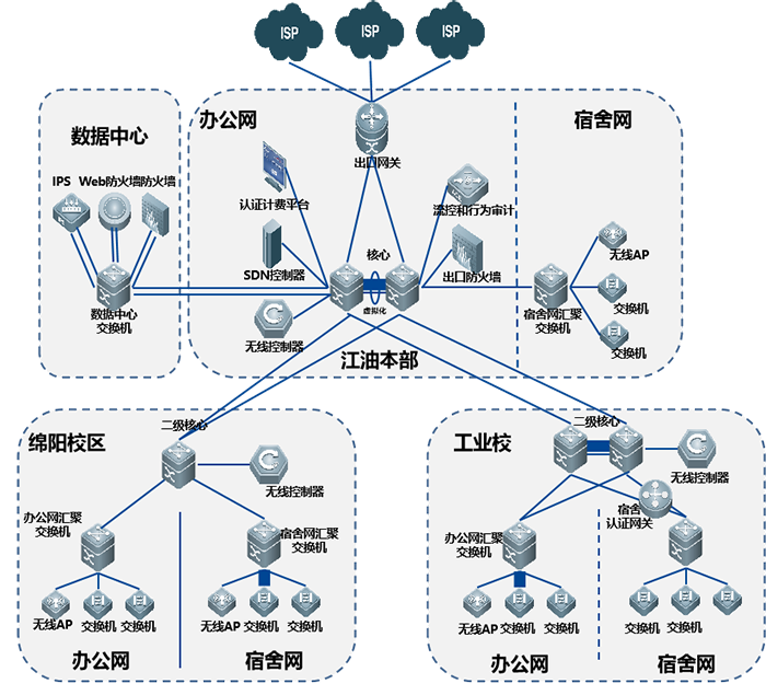 本次网络建设主要涉及SAM、2台8610E、1台RSR7716-X、E600/UAC/IDP/WG/SDN控制器等众多设备、50套智分三代无线AP,以及150余台汇聚和接入交换机等。
