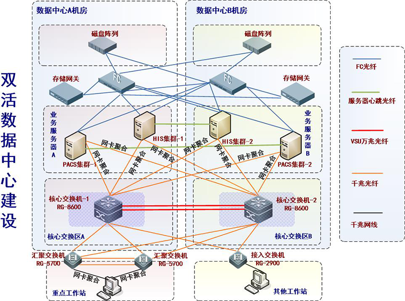 在德阳市人民医院的双活数据中心方案中,通过锐捷8600核心交换机和57系列汇聚交换机的虚拟化技术,为医院的数据中心和园区网提供了可靠和快捷的数据转发路径,为双活数据中心的稳定运行提供网络支持。